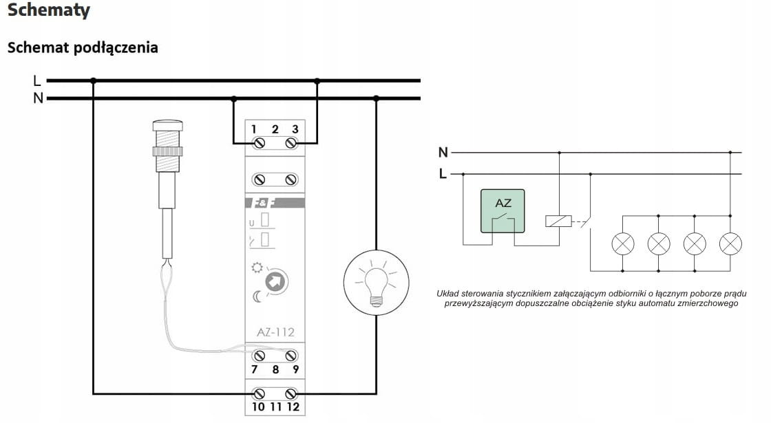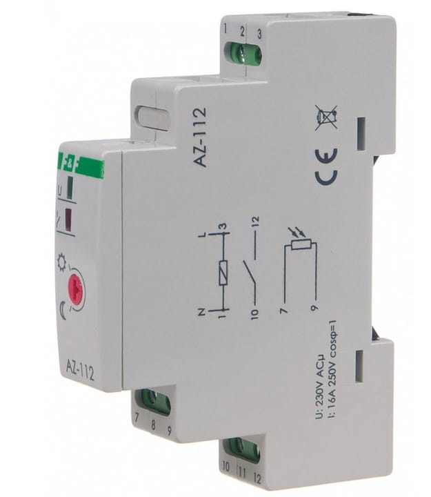 Zmierzchowy włącznik AZ-112 należy umieścić w miejscu o stałym dostępie naturalnego światła dziennego. Zmiany jego intensywności (pora dnia) będą powodowały załączanie i wyłączanie oświetlenia. Czas załączenia oświetlenia może być ustawiony przez użytkownika potencjometrem. Obrót w stronę “księżyca“ - załączy później, obrót w stronę “słoneczka“ - załączy wcześniej. Zmierzchowy włącznik AZ-112 posiada układ opóźniający załączenie i wyłączenie oświetlenia, niwelując w ten sposób wpływ zakłóceń (np. wyładowań atmosferycznych) na pracę automatu.