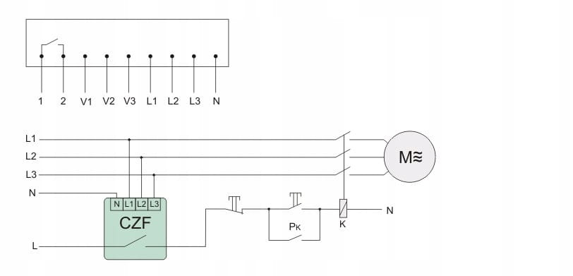 DziałanieZanik napięcia w co najmniej jednej, dowolnej fazie lub asymetria napięciowa między fazami powyżej progu zadziałania spowoduje wyłączenie silnika. Wyłączenie nastąpi z opóźnieniem 4 s, co zapobiega odłączeniu silnika przy chwilowym spadku napięcia. Ponowne załączenie nastąpi automatycznie przy wzroście napięcia o 5 V powyżej napięcia zadziałania (tj. o wartość histerezy napięciowej). Awaria któregokolwiek ze styków stycznika załączającego silnik spowoduje wyłączenie silnika na stałe. Ponowne uruchomienie możliwe jest dopiero po całkowitym odłączeniu zasilania, usunięciu usterki stycznika i ponownym załączeniu.