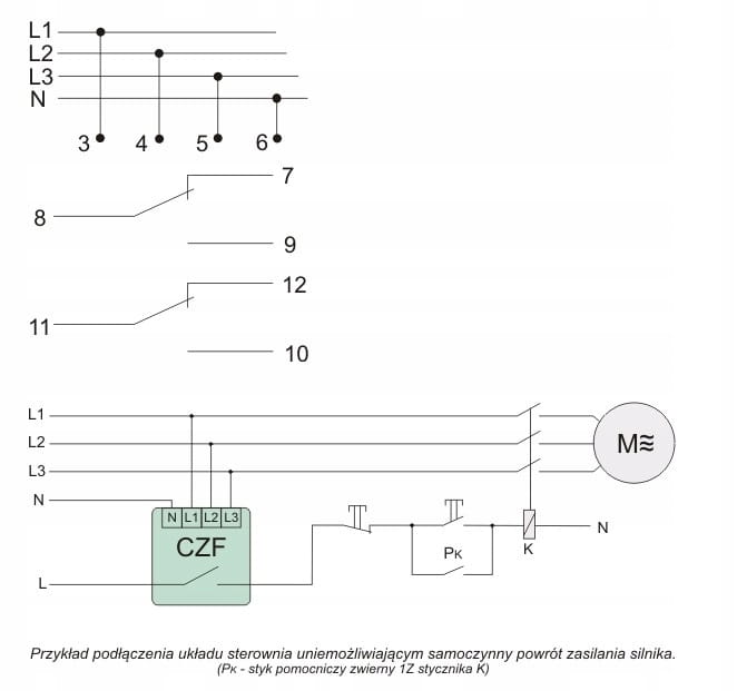 Zastosowanie dwóch styków przełącznych przekaźnika pozwala na podłączenie dodatkowego urządzenia lub układu kontrolowanego oraz układu sygnalizacji wizualnej lub dźwiękowej informującego o zadziałaniu przekaźnika, tj. wyłączeniu silnika.