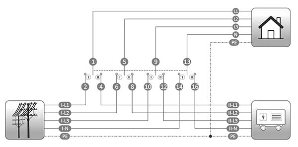 Modułowe przełączniki instalacyjne sieć-agregat realizują program przełączeń 1-0-2, dzięki czemu możliwe jest np. podłączenie do wyjścia jednej z dwóch linii wejściowych, lub całkowite rozłączenie obwodów.