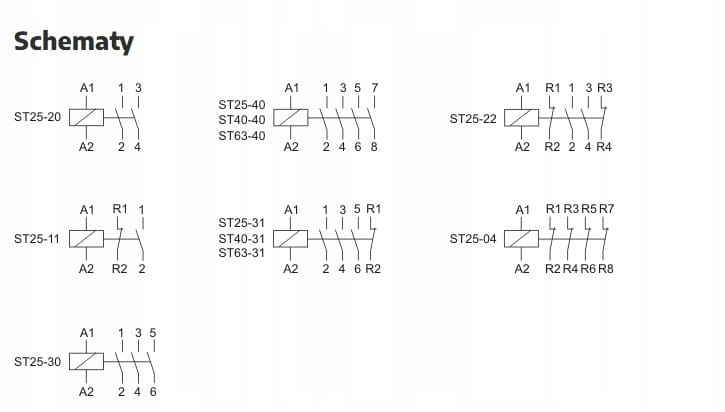 Działanie:Podanie napięcia zasilania na cewkę stycznika spowoduje przełączenie styku. Stan załączenia stycznika jest sygnalizowany czerwonym znacznikiem w okienku. Po zaniku napięcia zasilania styki powracają do pierwotnej pozycji.