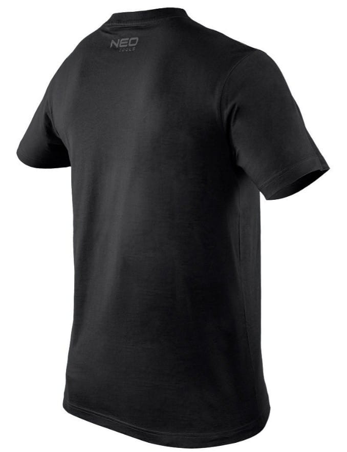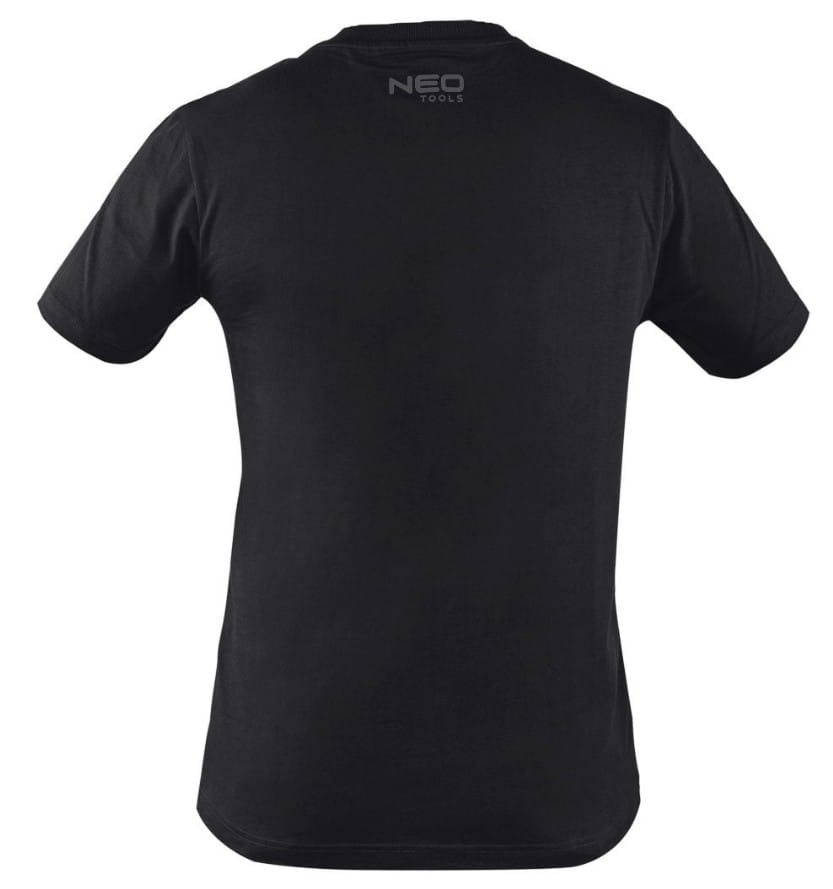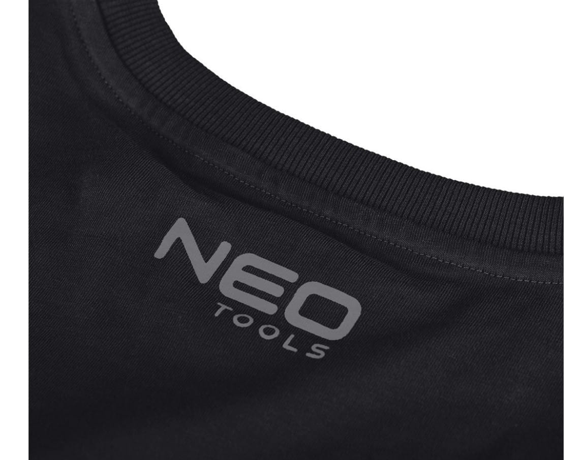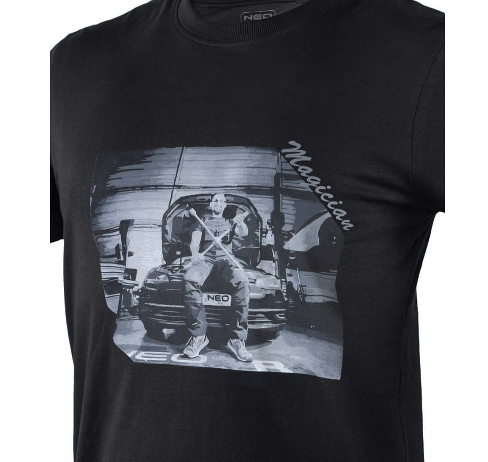 T-shirt z nadrukiem, mechanik, rozmiar XL, 81-682-XL marki NEO TOOLS to koszulka z krótkim rękawem. Charakteryzuje się czarnym kolorem oraz oryginalnym nadrukiem na przodzie. Grafika photoprintu przedstawia mechanika w pracy. Napis ,,magician” wkomponowany jest w nadruk. To projekt przeznaczony dla miłośników mechaniki. T-shirt wykonany został z dzianiny 100% bawełna o gramaturze 180 g/m2. Drukowane logo na karku, a także wszywka imienna ułatwiają personalizację odzieży. Koszulka posiada okrągły dekolt wykończony elastyczną wypustką. Jest unikalnym projektem własnym marki NEO TOOLS.