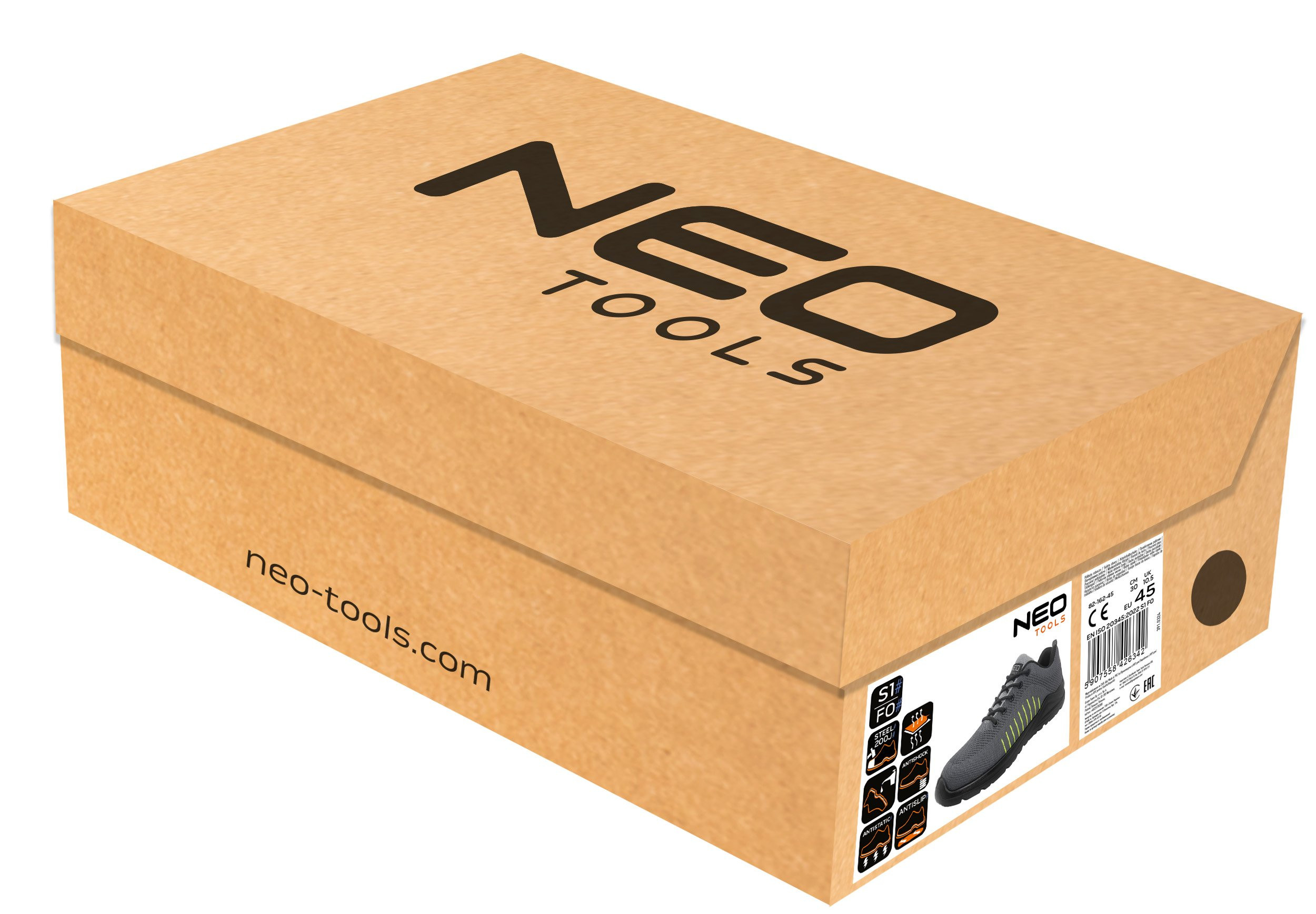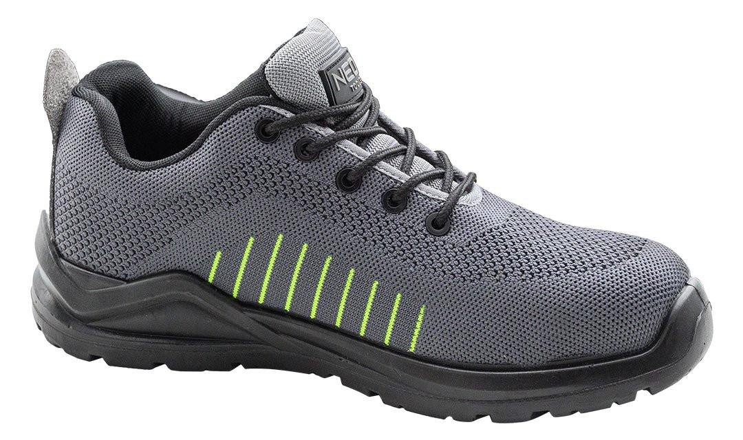 Półbuty robocze S1 FO, stalowy podnosek, rozmiar 45, 82-162-45 marki NEO TOOLS to obuwie wykonane w kategorii ochronnej S1 FO, charakteryzujące się podnoskiem zapewniającym zabezpieczenie przed uderzeniami z energią równą 200J, odpornością na oleje, benzynę i inne rozpuszczalniki organiczne. Półbuty robocze NEO TOOLS posiadają solidny stalowy podnosek, cholewkę dzianinową flyknit oraz wyściółkę z dzianiny typu ,,siatka”. Obuwie wyposażone zostały także w podeszwę z PU/PU i we wkładkę piankową EVA. Metalowy podnosek chroni stopę przed kontuzjami. Cholewka półbutów roboczych NEO TOOLS typu flyknit tkana jest z jednej nici, co wpływa na lekką konstrukcję oraz bardzo dobre dopasowanie obuwia do stopy. Produkt posiada zgodność z certyfikatem CE, według normy EN ISO 20345.