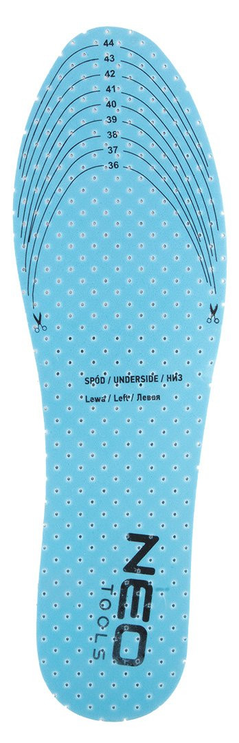 Wkładki do butów actifresh, do docięcia 36-45, 82-330 marki NEO TOOLS to wkładki do różnego rodzaju obuwia – roboczego, turystycznego, a także do użytkowania na co dzień. Umożliwiają dopasowanie do rozmiarów od 36 do 45. Wykonane z pianki lateksowej, chronią stopy przed bakteriami, drożdżami i pleśnią. Eliminują nieprzyjemne zapachy, a dzięki perforacjom zapewniają dobrą cyrkulację powietrza. Wkładki NEO TOOLS posiadają linie do prostego docięcia. Sprawią, że obuwie stanie się wygodniejsze i bardziej komfortowe w użytkowaniu – nawet podczas intensywnego dnia.