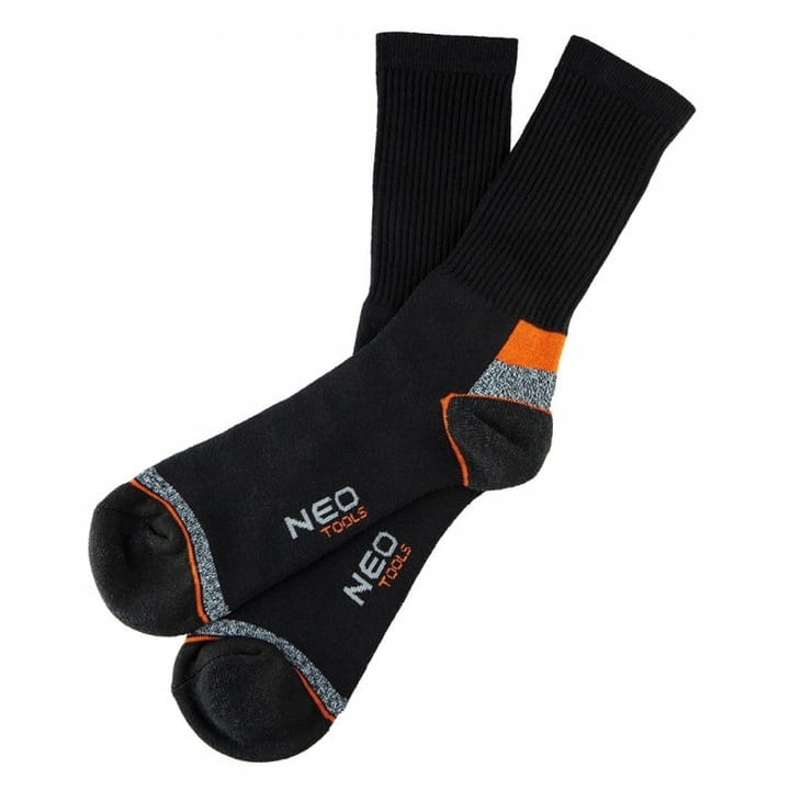 Specjalistyczne skarpety NEO wykonane z wysokiej jakości bawełny z dodatkiem poliestru i elastanu, zapewniają komfort i higienę pracy. Na palcach oraz piętach zastosowano wzmocnienia, które chronią przed szybkimi przetarciami. W dyskretnym czarnym kolorze z pomarańczowo-szarymi wstawkami.