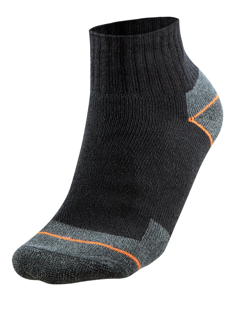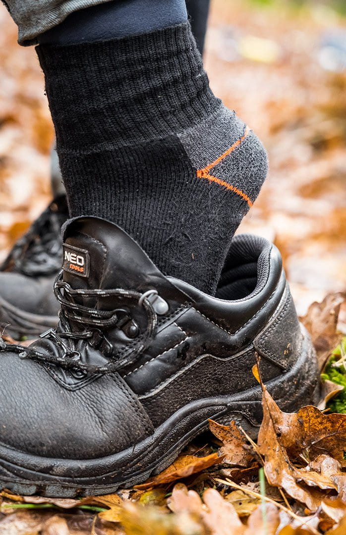 Specjalistyczne skarpety NEO wykonane z wysokiej jakości bawełny z dodatkiem poliestru, elastanu i akrylu, zapewniają komfort i higienę pracy. Na palcach oraz piętach zastosowano wzmocnienia, które chronią przed szybkimi przetarciami. W dyskretnym czarnym kolorze z pomarańczowo-szarymi wstawkami.