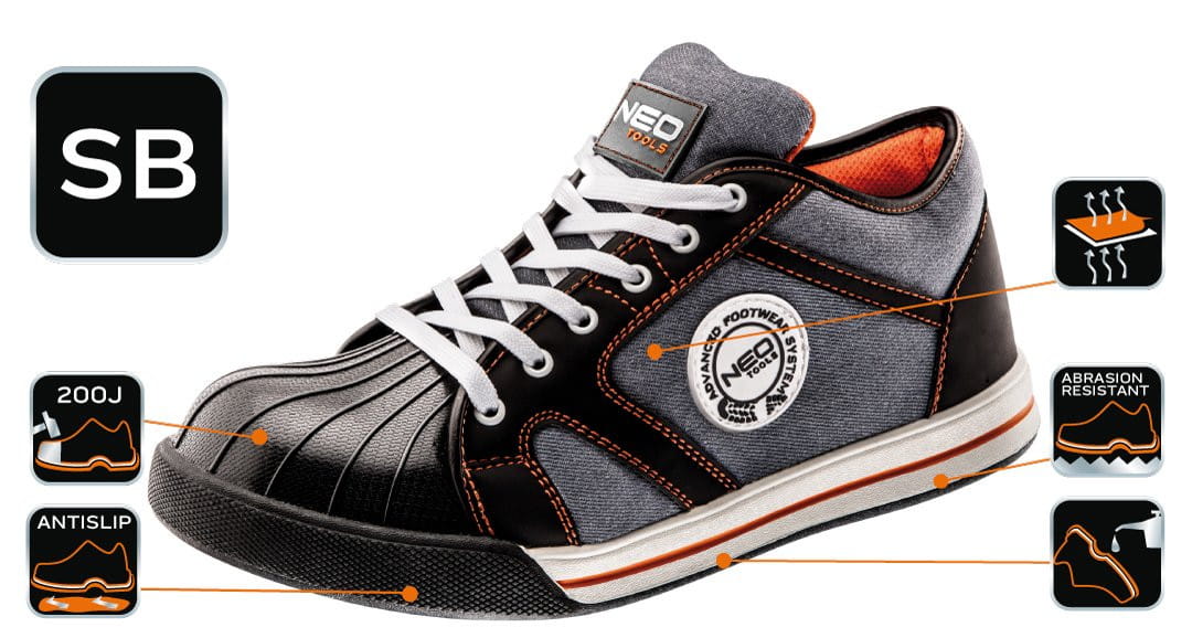Półbuty robocze, SB FO, podnosek stalowy, rozmiar 40, 82-111 marki NEO TOOLS to podstawowa ochrona podczas pracy. Cholewka wykonana z przewiewnego materiału oraz anty-poślizgowa podeszwa z pianki EVA pokryta gumą zapewniają wysoki komfort i skuteczne amortyzowanie wstrząsów, gwarantując również bezpieczeństwo i wygodę. Tył buta wzmocniony tworzywem oraz metalowy nosek chronią przed urazami mechanicznymi. Dzięki miękkiemu wykończeniu wewnątrz buta komfort pracy pozostaje na wysokim poziomie. Półbuty robocze NEO TOOLS posiadają kategorie SB FO, potwierdzającą odporność podeszwy obuwia na węglo-wodory (oleje, benzynę, itp.). Oznaczenie CE to z kolei gwarancja bezpieczeństwa, dowodząca, że produkt spełnia wszystkie unijne wymagania.