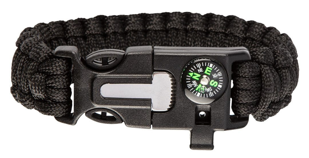 - Zestaw zawiera: bransoletka przetrwania (lina paracord, krzesiwo, kompas)