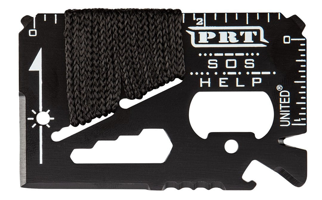 - Zestaw zawiera: karta wielofunkcyjna (wykonana ze stali nierdzewnej, zawiera: otwieracz do butelek, otwieracz do puszek, piłę, klucz oczkowy w rozmiarach 4, 5, 6, 7 mm, miarka, wkrętak płaski, nóż, line paracord)