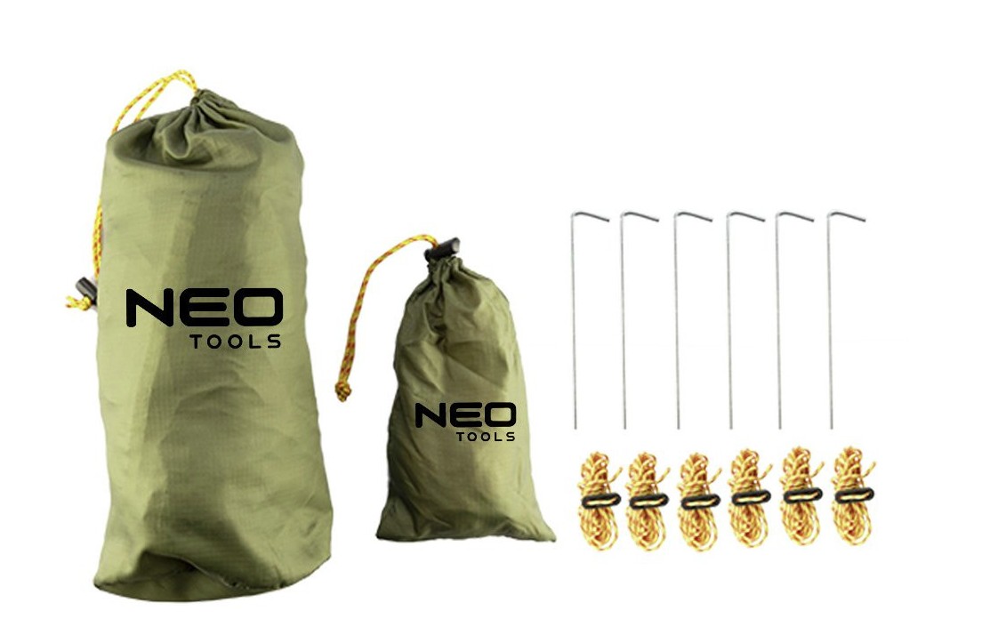 Tarp wodoodporny 360 x 290 cm 210T PU3000, 63-180 marki NEO TOOLS z wytrzymałego poliestru 210T o wodoodporności na poziomie 3000 PU. Tarp charakteryzuje się rozmiarem 360 x 290 cm. Posiada wzmocnione krawędzie oraz 6 aluminiowych oczek do dowolnego mocowania w różnych warunkach. Zestaw zawiera także 4 haki, 6 linek oraz 2 torby transportowe. Tarp od marki NEO TOOLS nie przepuszcza wody. Doskonale chroni przed deszczem, wiatrem oraz słońcem. Sprawdzi się nie tylko na biwaki czy wyprawy survivalowe.
