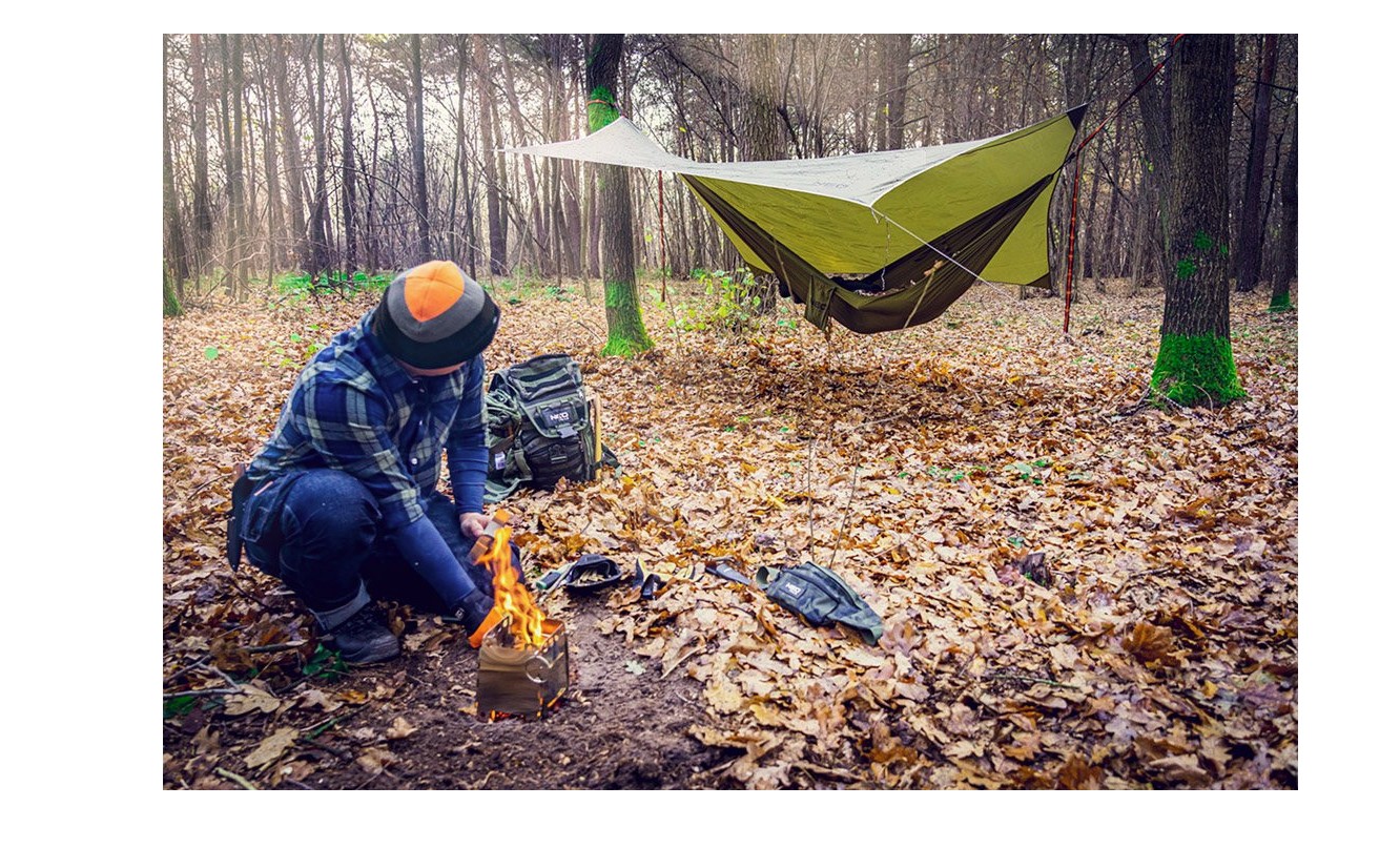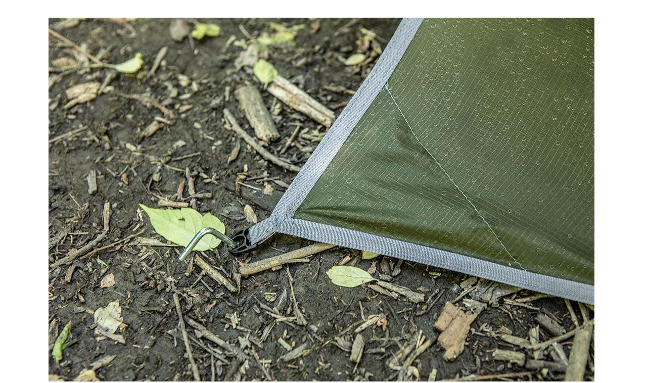 Tarp wodoodporny, materiał : poliester 210T, wodoodporność 3000 PU, rozmiar 360 x 290 cm, wzmocnione krawędzie, 6 aluminiowych oczek, zestaw zamiera : tarp, 4 x haki, 6 x linki, 2 x torba transportowa.
