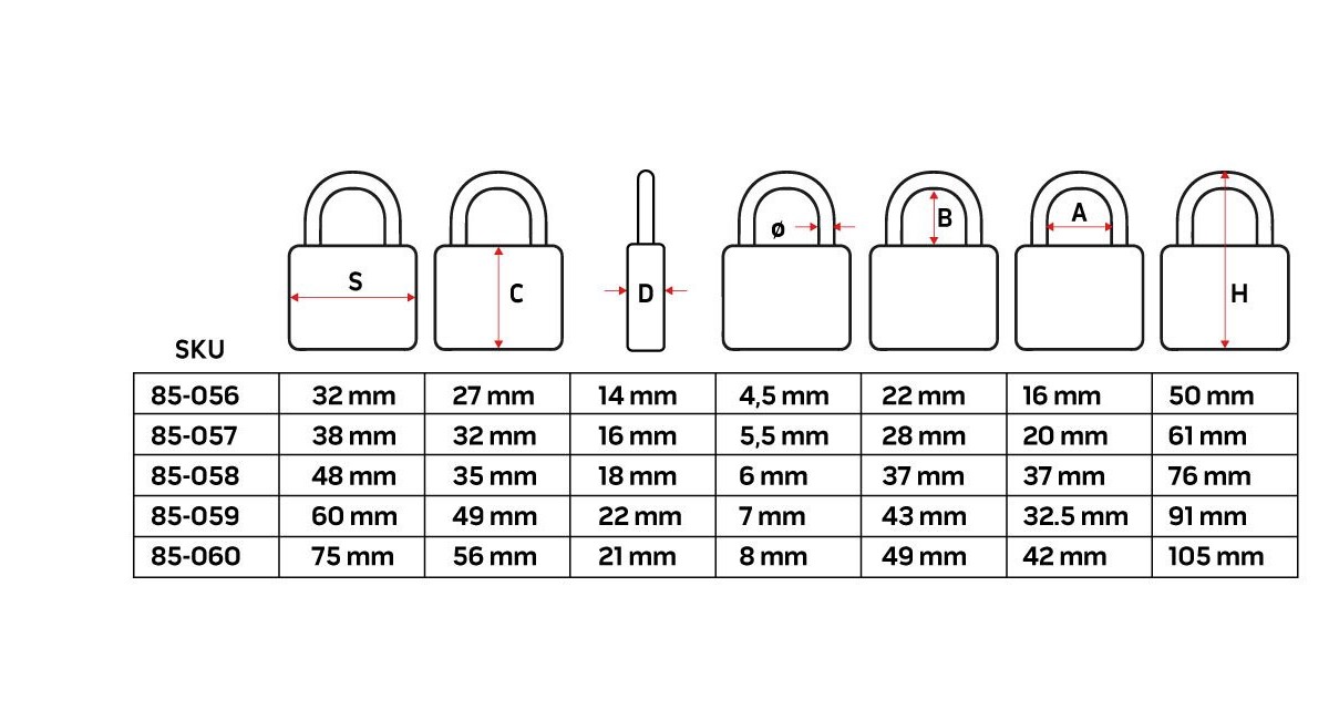Kłódka 75 mm, 3 klucze, żeliwna, (LxWxH) 75 x 21 x 105 mm, średnica jarzma 8 mm, posiada uszczelki zabezpieczające mechanizm przed deszczem.