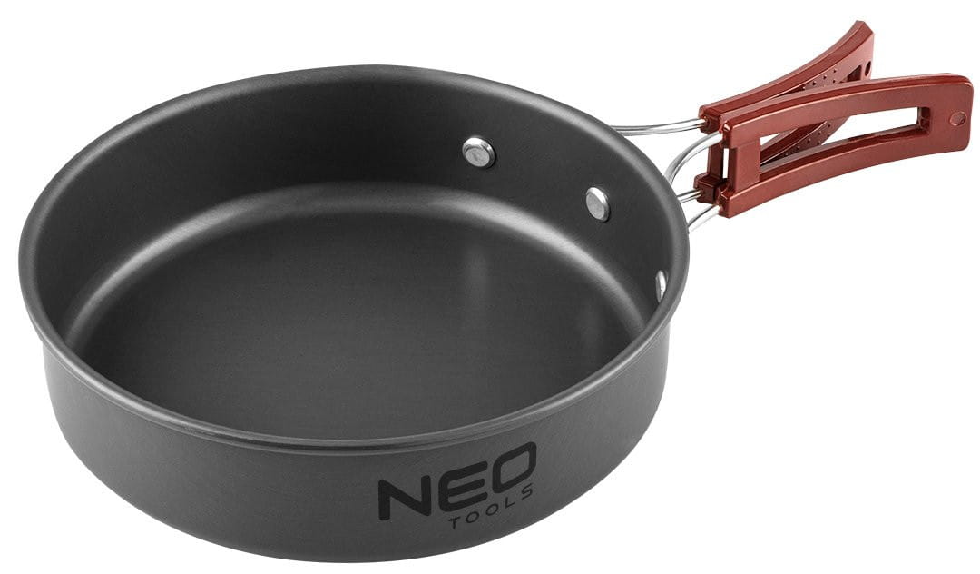 Naczynia turystyczne 7 w 1 63-146 marki NEO to garnek, patelnia, 2x talerz, chochla, łopatka i gąbka zaprojektowane z myślą o biwakach oraz wyprawach na łono natury. Waga zestawu to zaledwie 420 g, dzięki wykorzystaniu trwałego i lekkiego materiału – anodyzowanego aluminium oraz tworzywa sztucznego. Naczynia posiadają certyfikat dopuszczenia do kontaktu z żywnością LFGB. Charakteryzują się także składanymi, praktycznymi uchwytami izolowanymi. Garnek ma pojemność 1 l, średnicę 150 mm oraz wysokość 75 mm. Patelnia 0,6l ma wysokość 37 mm i średnicę 155 mm. To doskonała propozycja naczyń turystycznych od marki NEO na rozmaite wyprawy.