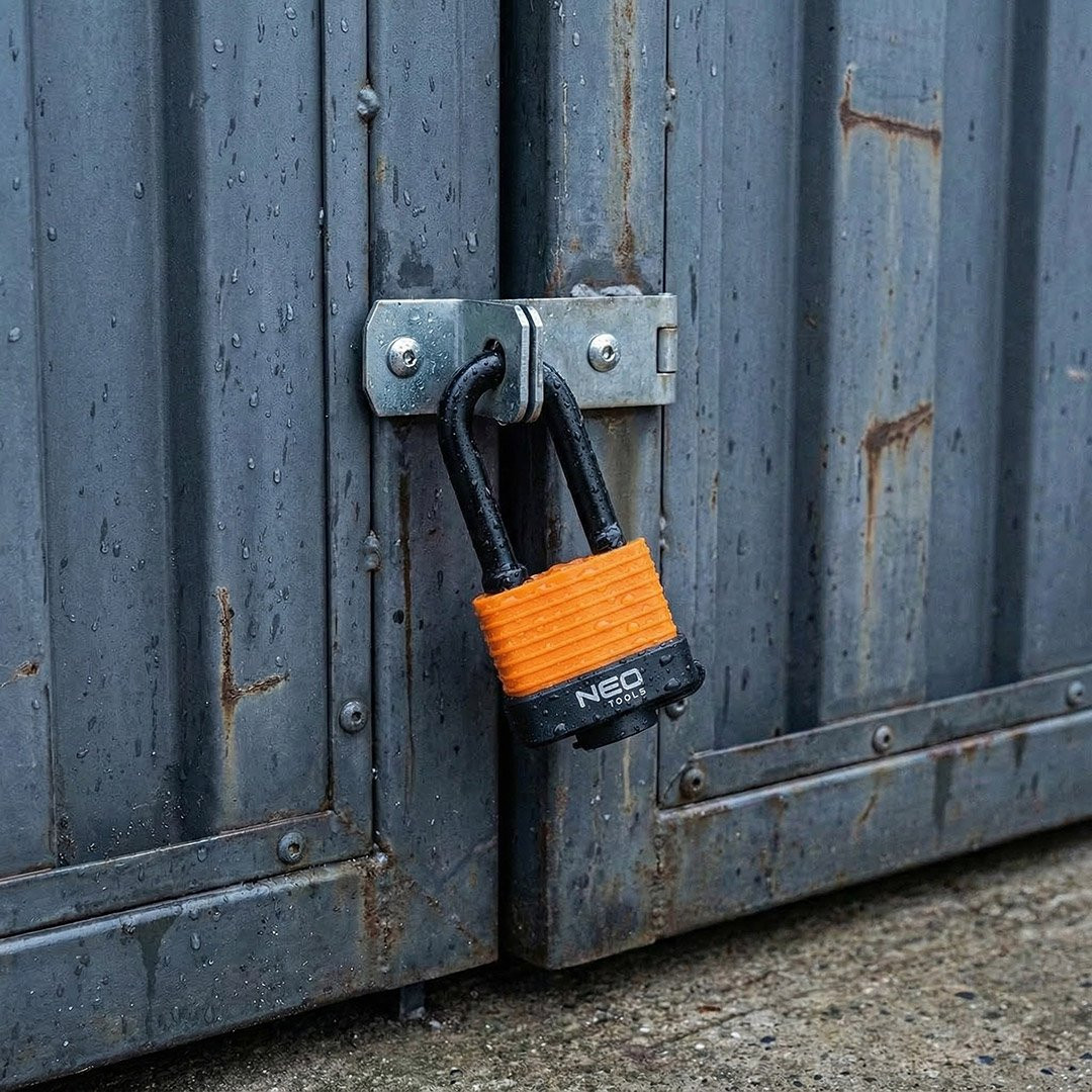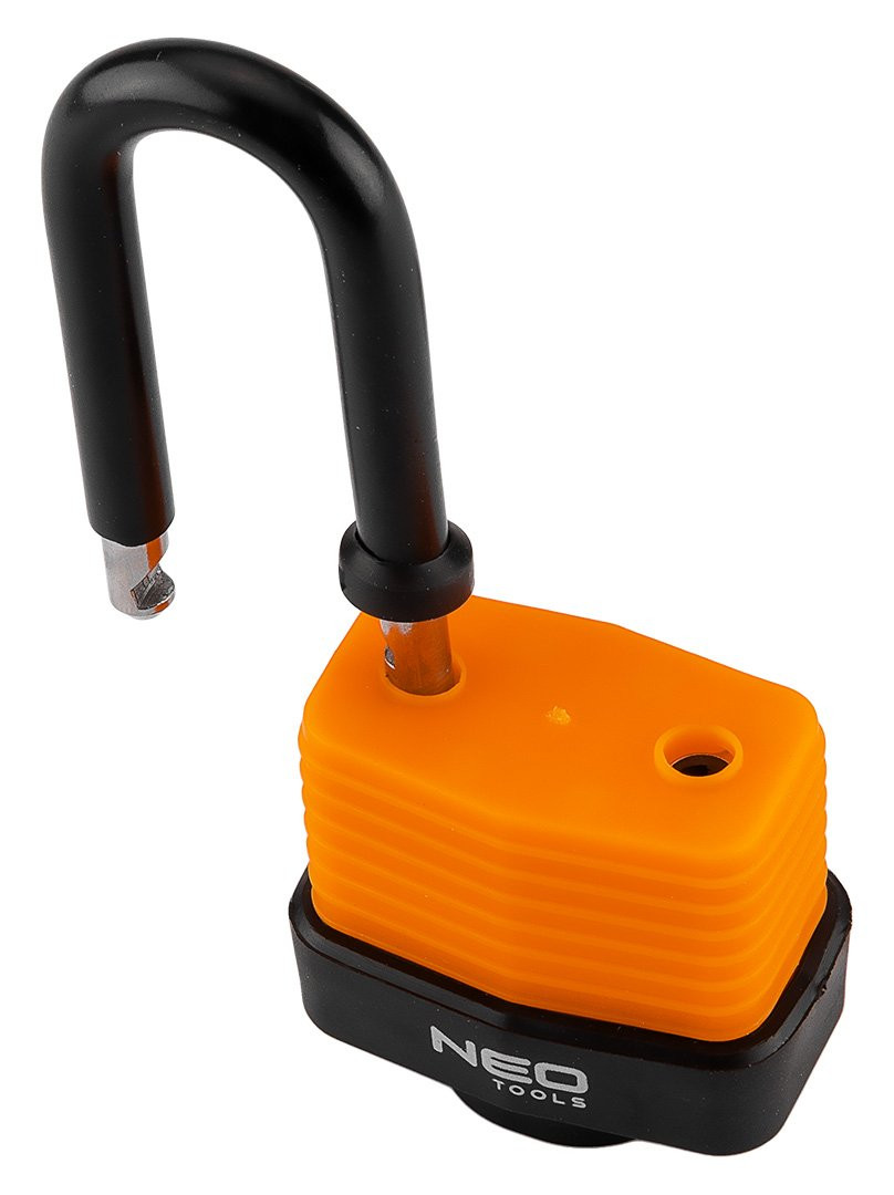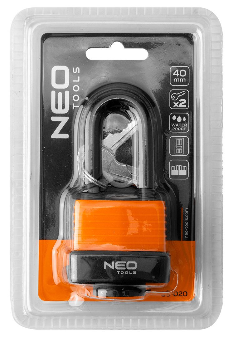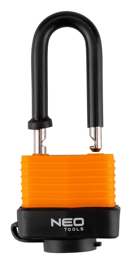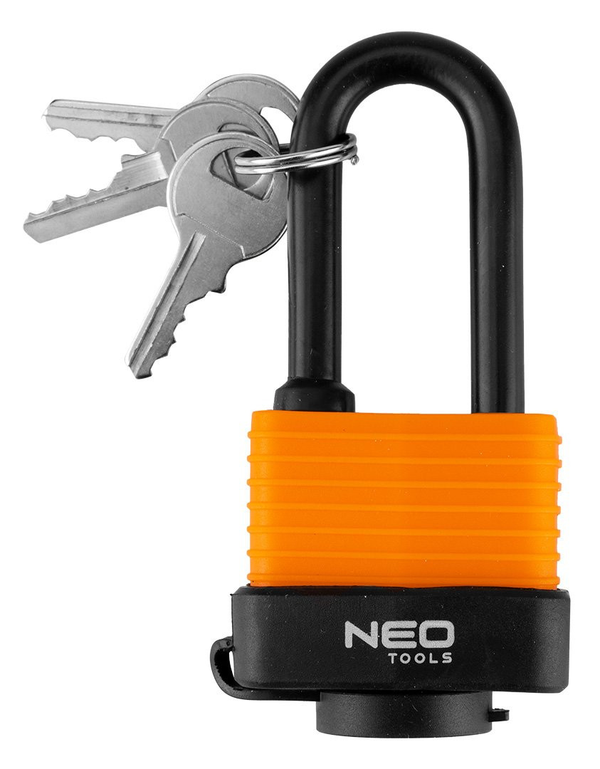Kłódka długa wodoodporna laminowana osłona gumowa 40 mm 85-020 marki NEO TOOLS to stalowa kłódka laminowana z plastikową osłoną oraz gumowymi pierścieniami na pałąku. Wyposażona w trzy klucze. Dzięki zastosowanym materiałom i odpowiedniej konstrukcji cechuje się wysoką odpornością na warunki atmosferyczne. Średnica pałąka wynosi 7,5 mm. To solidne zabezpieczenie, które sprawdzi się w różnych zastosowaniach – zarówno wewnętrznych, jak i zewnętrznych.