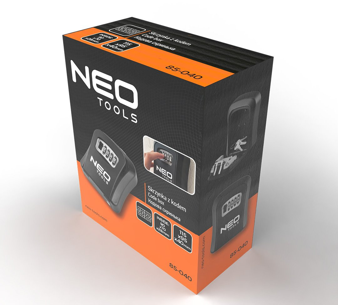 Skrzynka z kodem 115 x 95 x 40 mm 85-040 marki NEO TOOLS to praktyczne rozwiązanie zabezpieczające, wyposażone w mechaniczny zamek szyfrowy. Obudowa wykonana została z tworzywa sztucznego, natomiast mechanizm zamykający - ze stopu aluminium. Wewnętrzna przestrzeń o wymiarach 90 × 70 × 28 mm umożliwia bezpieczne przechowywanie drobnych przedmiotów, takich jak m.in. klucze. Solidna konstrukcja oraz kod szyfrowy zapewniają zwiększony poziom bezpieczeństwa i wygodę użytkowania. Skrzynka NEO TOOLS sprawdzi się w codziennym użytku zarówno wewnątrz, jak i na zewnątrz pomieszczeń.