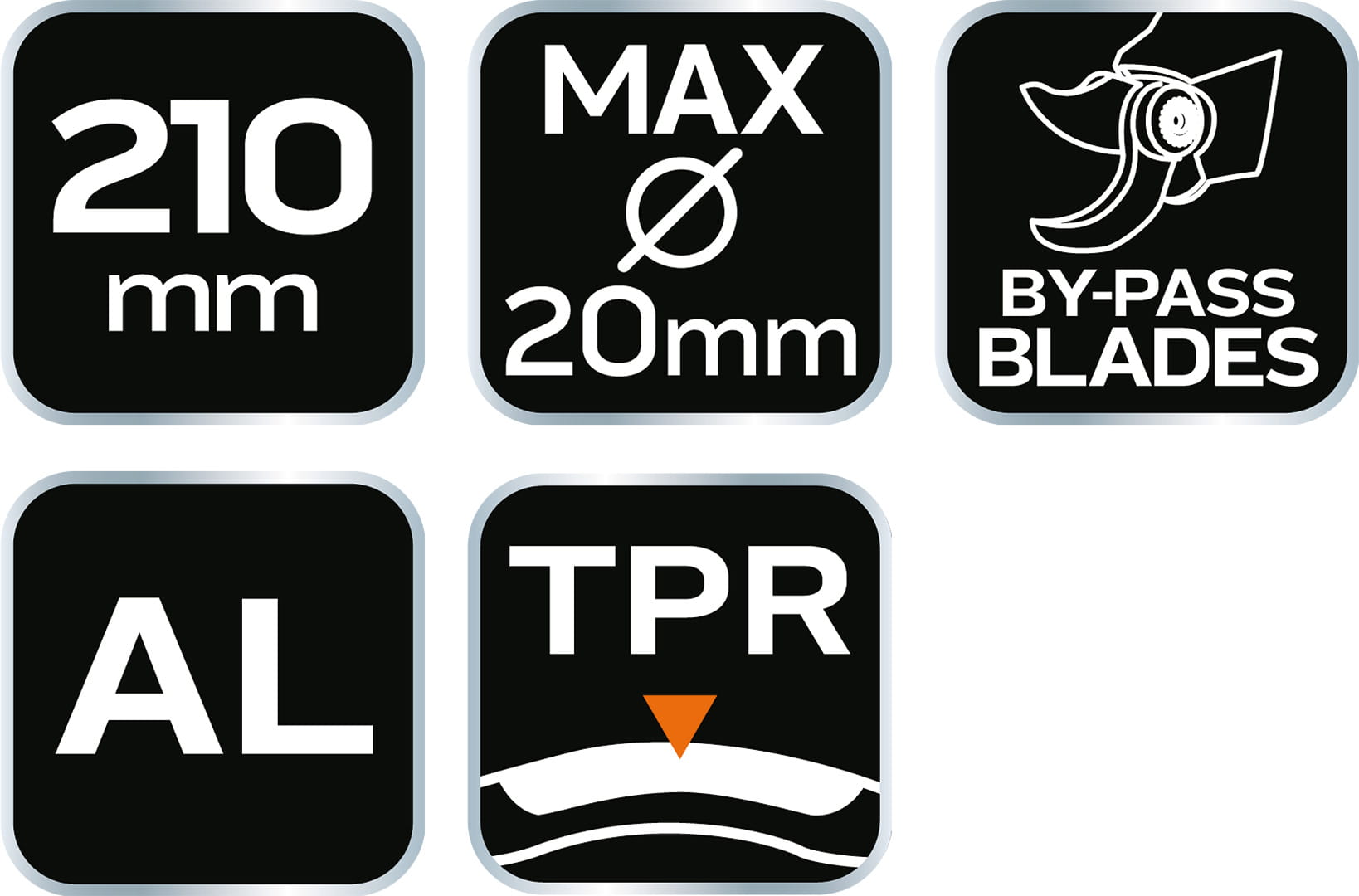 Sekator by-pass 210 mm, zakres do 20 mm, aluminiowy, uchwyt pokryty gumą TPR 15-212 marki NEO o długości całkowitej 210 mm, oferuje średnicę cięcia do 20 mm. Sekator wyposażony jest w stalowe ostrza z nieprzywierającą powłoką. Dobrze sprawdza się do cięcia kwiatów, przycinania żywych gałązek oraz młodych pędów. Posiada ergonomiczny uchwyt z aluminium z miękkimi elementami TPR. Za sprawą ostrza do świeżego i mokrego drewna charakteryzuje się większymi możliwościami. Blokada ostrza wpływa na bezpieczeństwo narzędzia. Sekator marki NEO polecany jest profesjonalistom oraz miłośnikom ogrodnictwa.