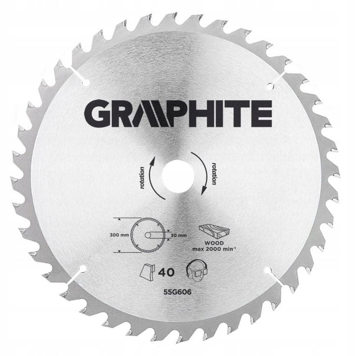 Tarcza do pilarki widiowa GRAPHITE (nr ref. 55H606) o średnicy zewnętrznej 300 mm, wykonana ze stopu stali manganowej MN65 o dużej odporności na temperaturę i odkształcenia. Zęby z nakładkami z węglika spiekanego YG6A pozwalają na zgrubne cięcie drewna i materiałów drewnopochodnych, takich jak sklejka, płyta wiórowa, MDF. Zawarte w opakowaniu pierścienie redukcyjne umożliwiają zastosowanie tarczy do większości modeli pilarek.