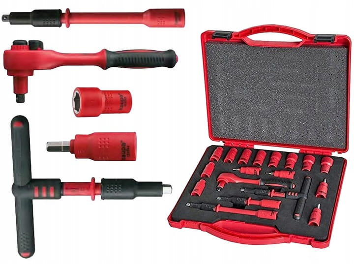 - Walizeczka z tworzywa wyłożona gąbką z narzędziami nasadowymi z grzechotką, VDE 1000 V 1/4". Izolacja z tworzywa odpornego na uderzenia do -40º C, co umożliwia bezpieczną pracę w niskich temperaturach.