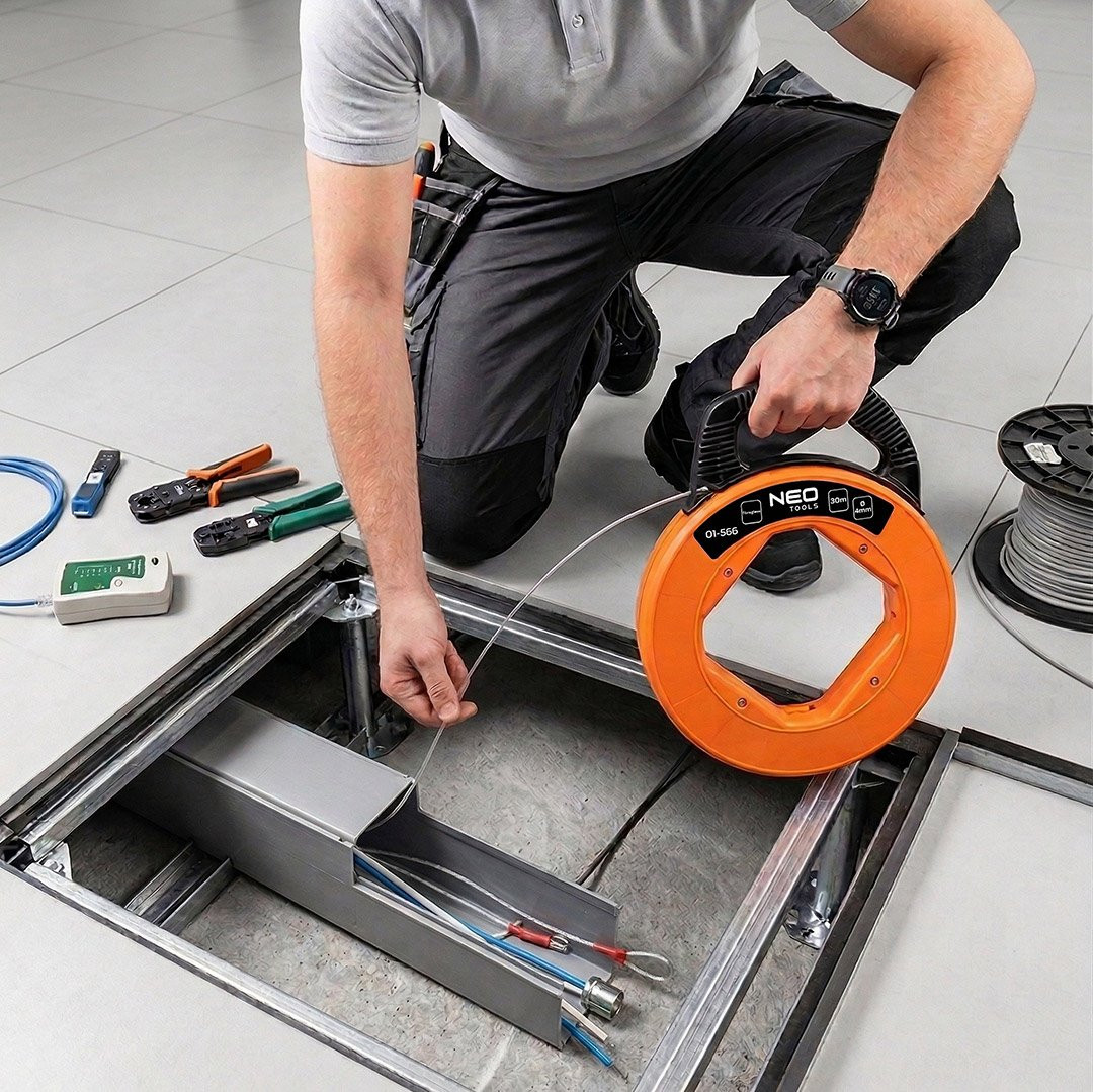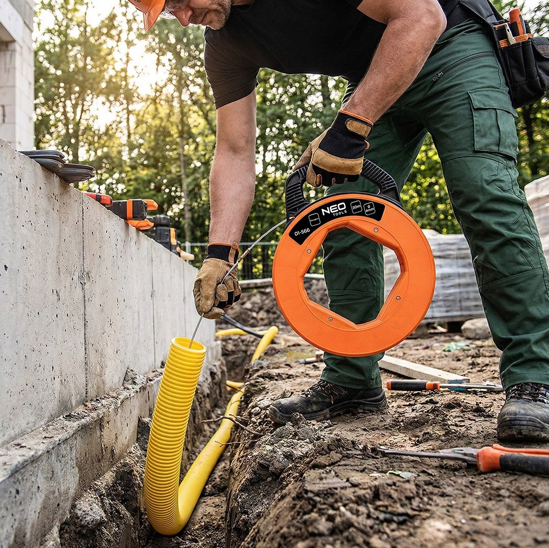 Pilot do przeciągania kabli 30m 01-566 marki NEO TOOLS to narzędzie przeznaczone do przeciągania kabli w instalacjach elektrycznych. Pilot o długości 30 m i średnicy 4 mm wykonany jest z włókna szklanego, co umożliwia sprawne prowadzenie przewodów w kanałach instalacyjnych. Korpus wykonano z tworzywa ABS i wyposażono w uchwyt do przenoszenia oraz ręczny zwijak ułatwiający obsługę i przechowywanie. Zastosowana końcówka do przyczepiania przewodów umożliwia stabilne przytrzymanie kabla podczas przeciągania. Pilot do przeciągania kabli NEO TOOLS pozwala na szybką pracę, wspierając oszczędność czasu podczas zadań instalacyjnych wykonywanych przez elektryków.