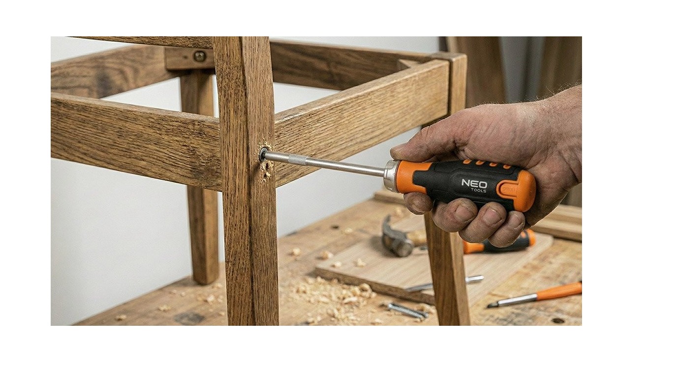 Wkrętak z grzechotką i zestawem bitów 12 sztuk 04-242 marki NEO TOOLS przeznaczony jest do prac warsztatowych i domowych oraz do napraw i regulacji. Narzędzie wykonane ze stali CRV i wyposażone w mechanizm grzechotkowy oraz magnetyczną końcówkę na bity. W zestawie znajduje się 12 bitów o długości 25 mm: płaskie 4, 5 i 6 mm, krzyżakowe PH1, PH2 i PH3, torx T15, T20 i T25 oraz imbusowe H3, H4 i H5. Bity są chowane w uchwycie wkrętaka, co ułatwia ich przechowywanie i zapewnia szybki dostęp do właściwej końcówki. Dwukomponentowy uchwyt zwiększa komfort oraz pewność chwytu podczas pracy, umożliwiając sprawne wykonywanie różnorodnych zadań montażowych i serwisowych.