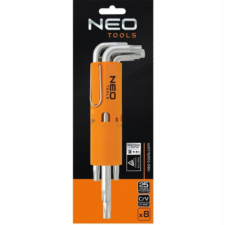 Zestaw kluczy Torx z otworem NEO (nr ref. 09-524) zawiera 8 kluczy w rozmiarze od TT10 do TT50, wykonanych ze stali chromowo-wanadowej. Całość umieszczona w praktycznym opakowaniu. Marka NEO spełnia oczekiwania profesjonalistów.