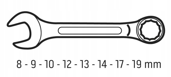 - Klucze płasko-oczkowe w zestawie: rozmiary: 8, 9, 10, 12, 13, 14, 17, 19 mm, tekstylne etui