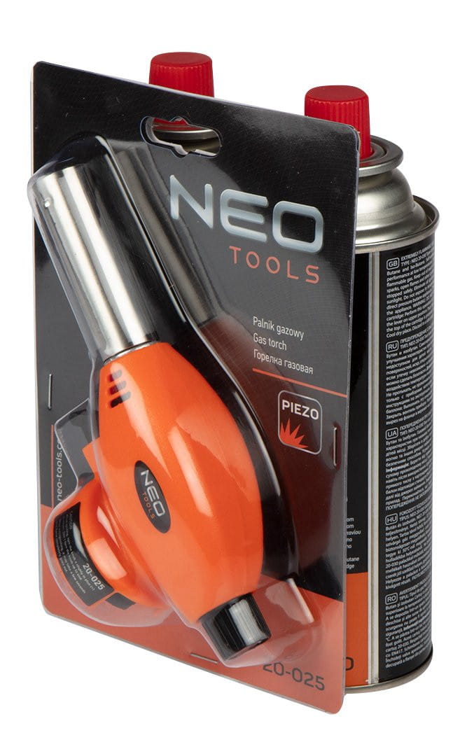 Palnik gazowy nakręcany NEO na naboje 227 g (typ EN 417), temperatura pracy 1300°C, moc 1.11 kW. W zestawie z dwoma nabojami z gazem butan NEO o wadze 227 g. Palnikiem można pracować w pozycji pionowej (+/-80 stopni). Posiada zapłon piezo, który pozwala na szybkie odpalenie lampy. Nabój o uniwersalnym zastosowaniu np. w lampach lutowniczych lub kuchenkach turystycznych.