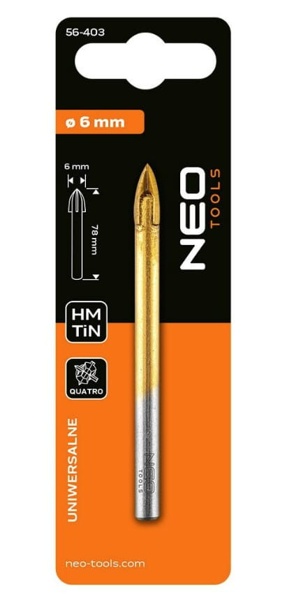Wiertło uniwersalne HM, 6 mm 56-403 marki NEO TOOLS to akcesorium o średnicy 6 mm i długości całkowitej 78 mm, wyposażone w uchwyt cylindryczny oraz 4 ostrza z węglika spiekanego (TCT), pokryte powłoką TiN. Przeznaczone jest do wiercenia bezudarowego przy maksymalnej prędkości obrotowej 2000 obr/min. Wiertło NEO TOOLS sprawdza się przy wykonywaniu otworów w różnych materiałach, takich jak: tworzywa sztuczne, aluminium, cegła, ceramika oraz szkło. Może więc pełnić funkcję narzędzia wielozadaniowego w typowych pracach montażowych i wykończeniowych.