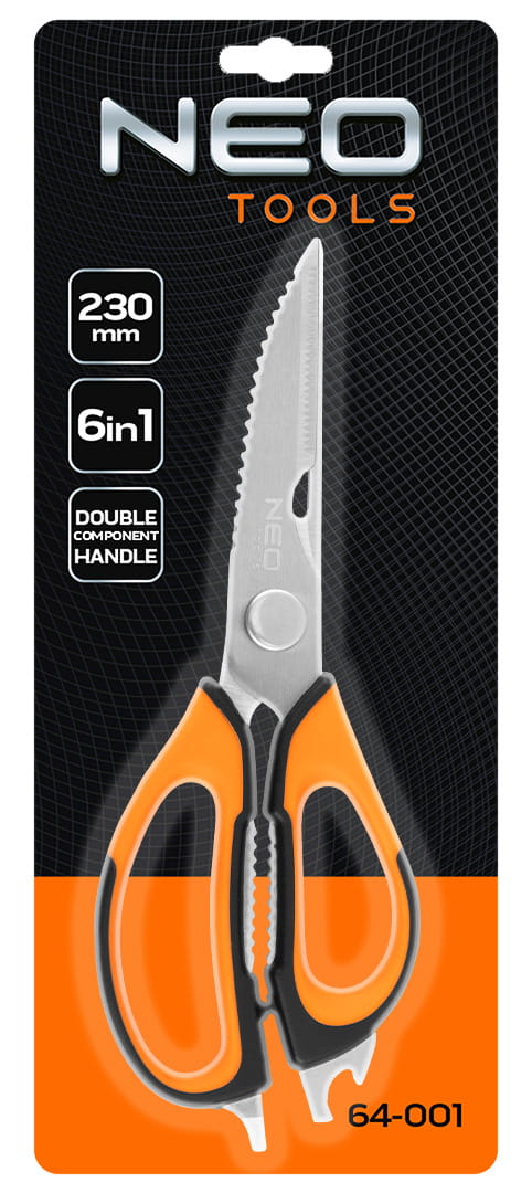 Nożyczki 230 mm 6 w 1, 64-001 marki NEO to nożyczki o długości 230 mm i oferowanych 6 funkcjach w jednym narzędziu. Posiadają praktyczny, dwukomponentowy uchwyt oraz korpus rozkładany na dwie części. Mogą pełnić zadania dziadka do orzechów, otwieracza do butelek, noża do otwierania kartonów, skrobaka i obieraka. Sprawdzą się w domu, w garażu lub w warsztacie. Wysoka trwałość nożyczek NEO przysłuży się na wiele lat użytkowania.