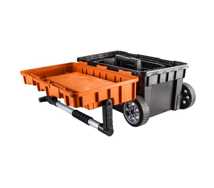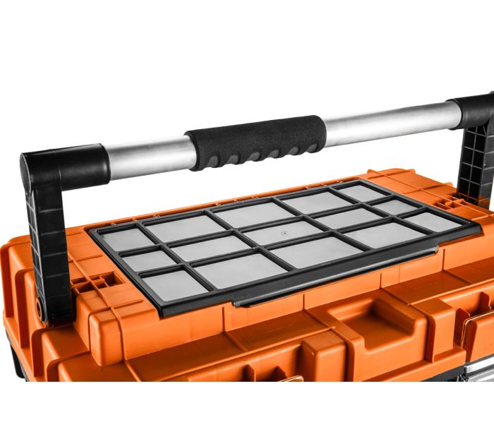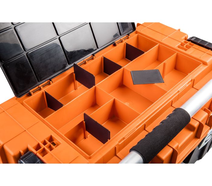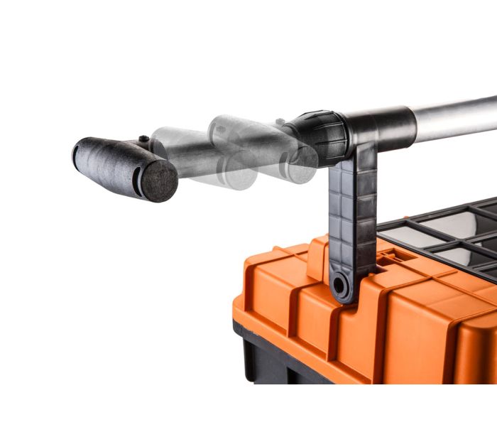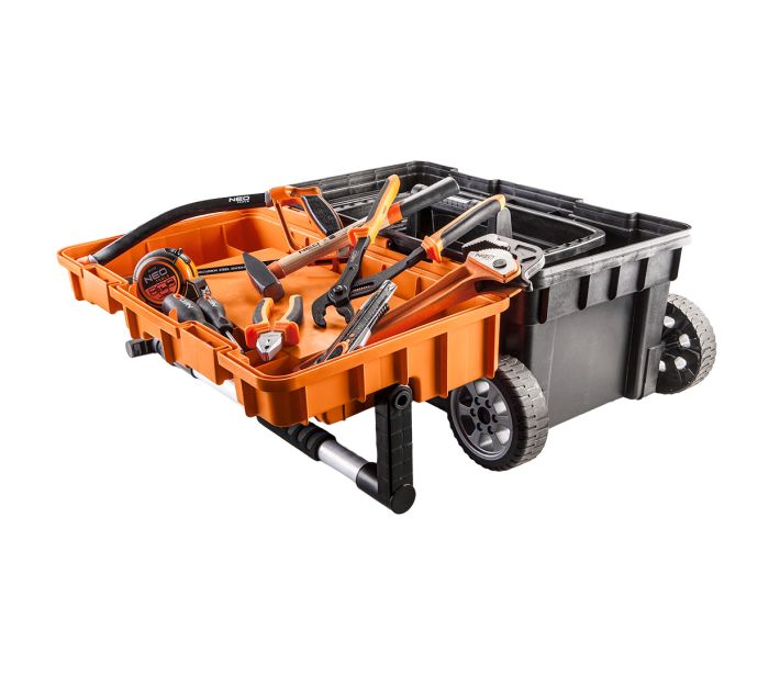 Skrzynka narzędziowa NEO (nr ref. 84-116) o wymiarach 68 x 40 x 35.5 cm. Pojemna i mobilna skrzynka narzędziowa wykonana z wytrzymałego tworzywa sztucznego z metalowymi zapięciami. Skrzynka posiada pojemny organizer do przechowywania drobnych elementów, tackę wewnątrz i wygodny teleskopowy uchwyt do przenoszenia a także ciągnięcia. Skrzynka wyposażona jest w dwa koła umożliwiające prowadzenie. Marka NEO spełnia oczekiwania profesjonalistów.