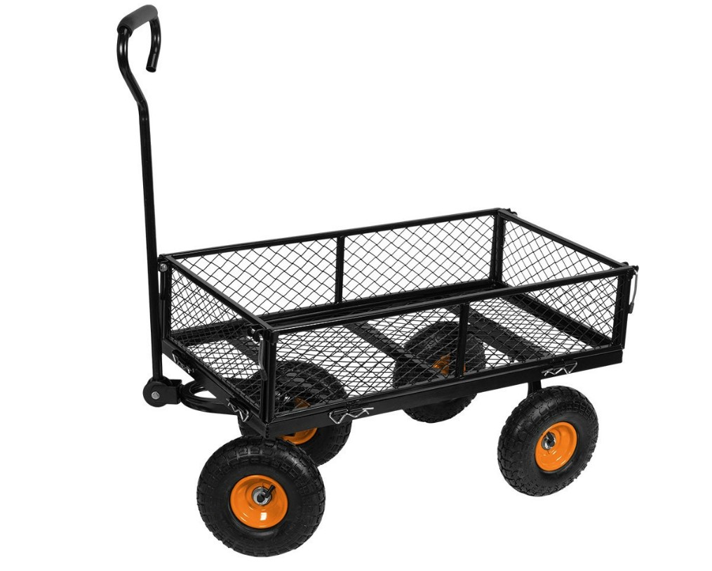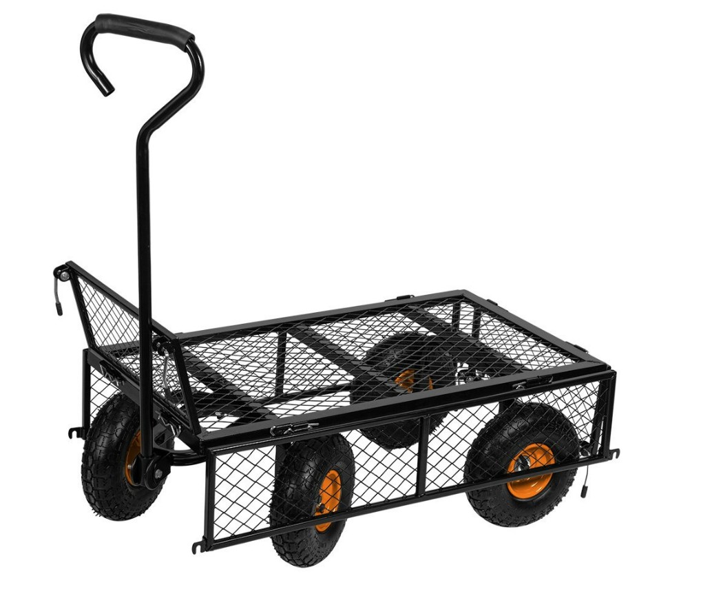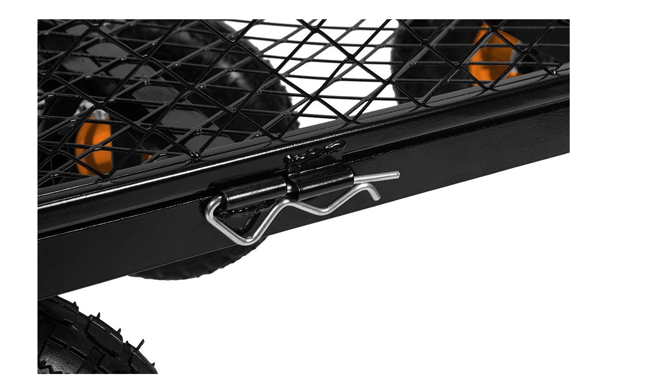 Wózek ogrodowy stalowy, udźwig do 300kg, składane boki, uchwyt do ciągnięcia z miekką pianką, pompowane koła z wentylem w rozmiarze 10 cali, przednia oś ruchoma, rozmiar paki 890 x 490 x 190mm, waga wózka 16kg,