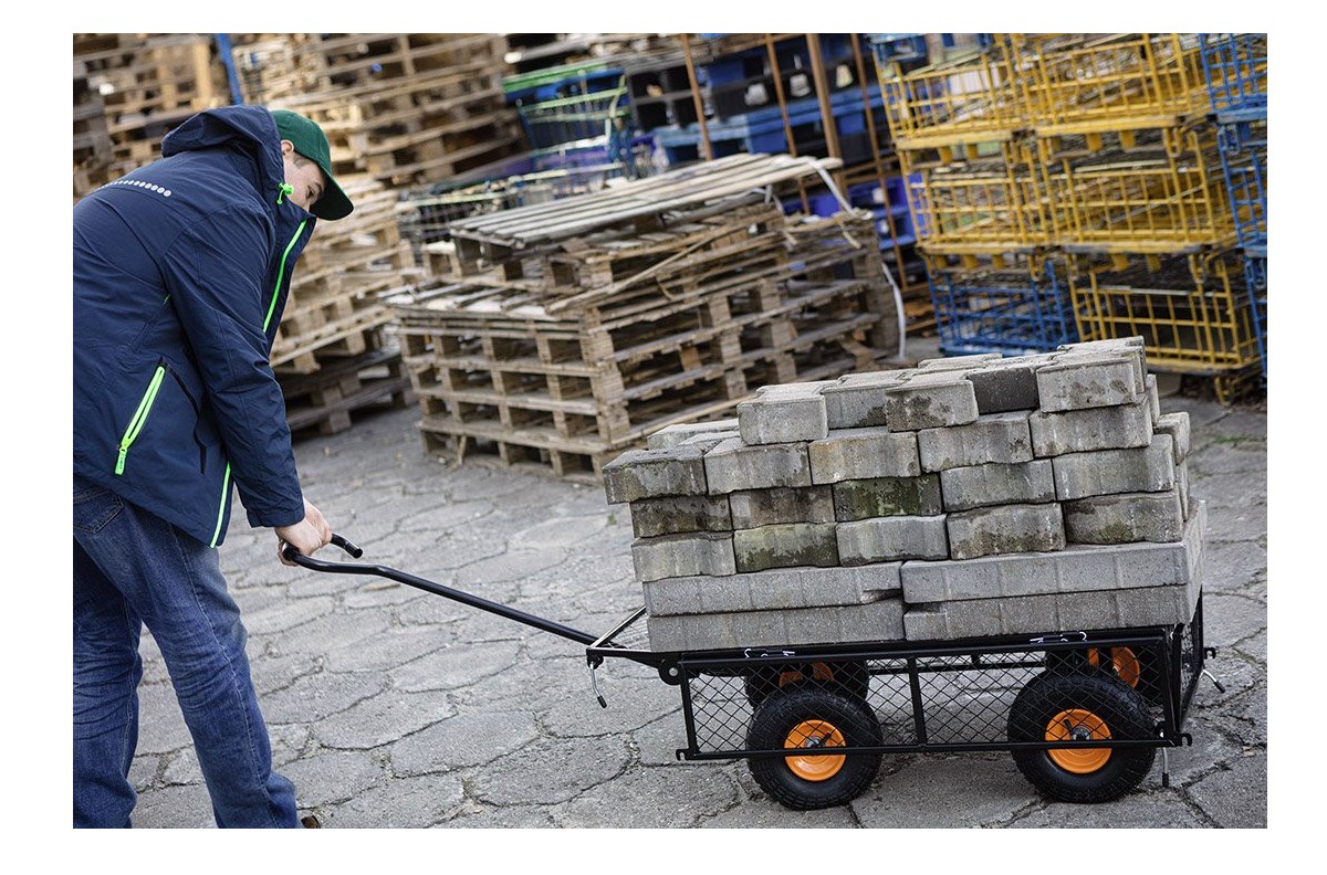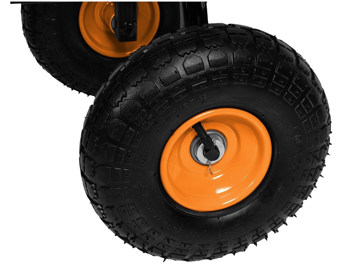 Wózek ogrodowy stalowy 300 kg 84-406 marki NEO TOOLS to wykonany z części stalowych, solidny wózek ogrodowy o udźwigu do 300 kg. Wyposażony w składane, praktyczne boki oraz uchwyt do ciągnięcia z miękką pianką, charakteryzuje się łatwością w obsłudze oraz wygodą w użytkowaniu. Wózek NEO TOOLS przeznaczony do celów ogrodowych posiada pompowane koła z wentylem o średnicy 10 cali. Ruchoma przednia oś zwiększa możliwości manewrowania. Waga wózka wynosi zaledwie 16 kg. Świetnie sprawdzi się m.in. podczas przewodu drewna kominkowego.