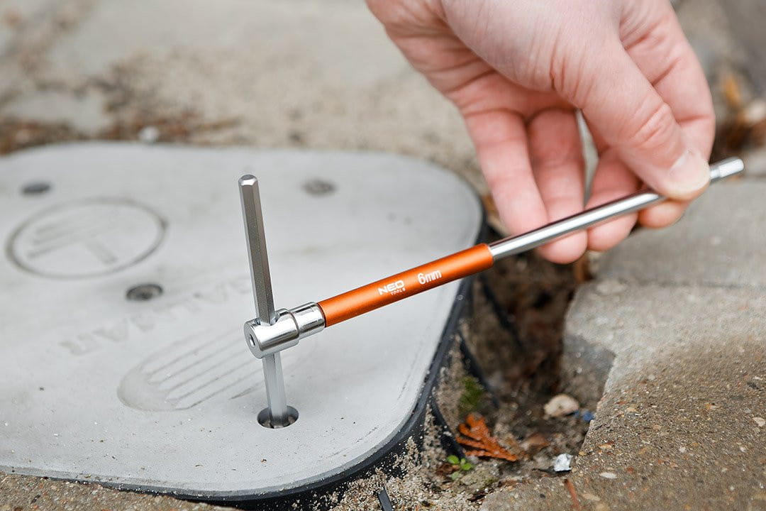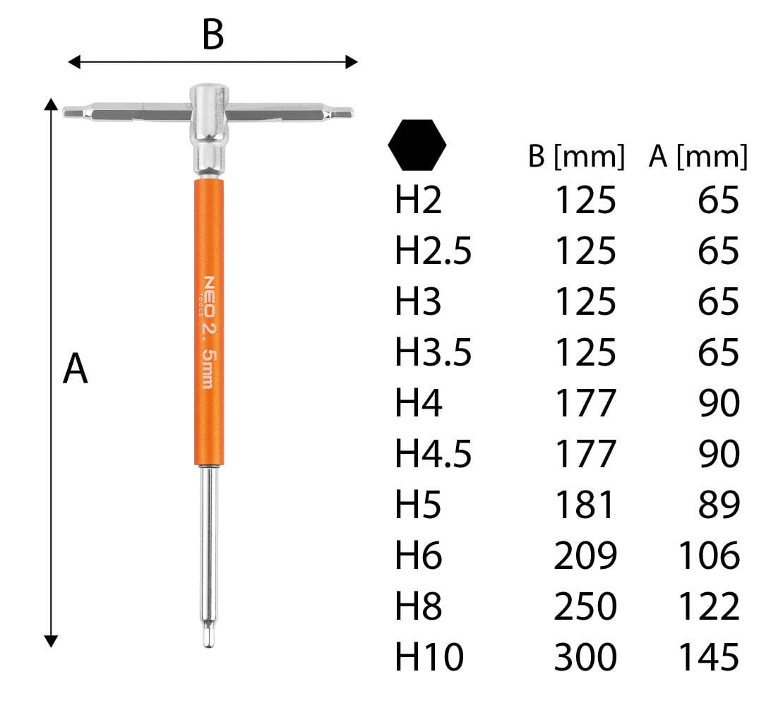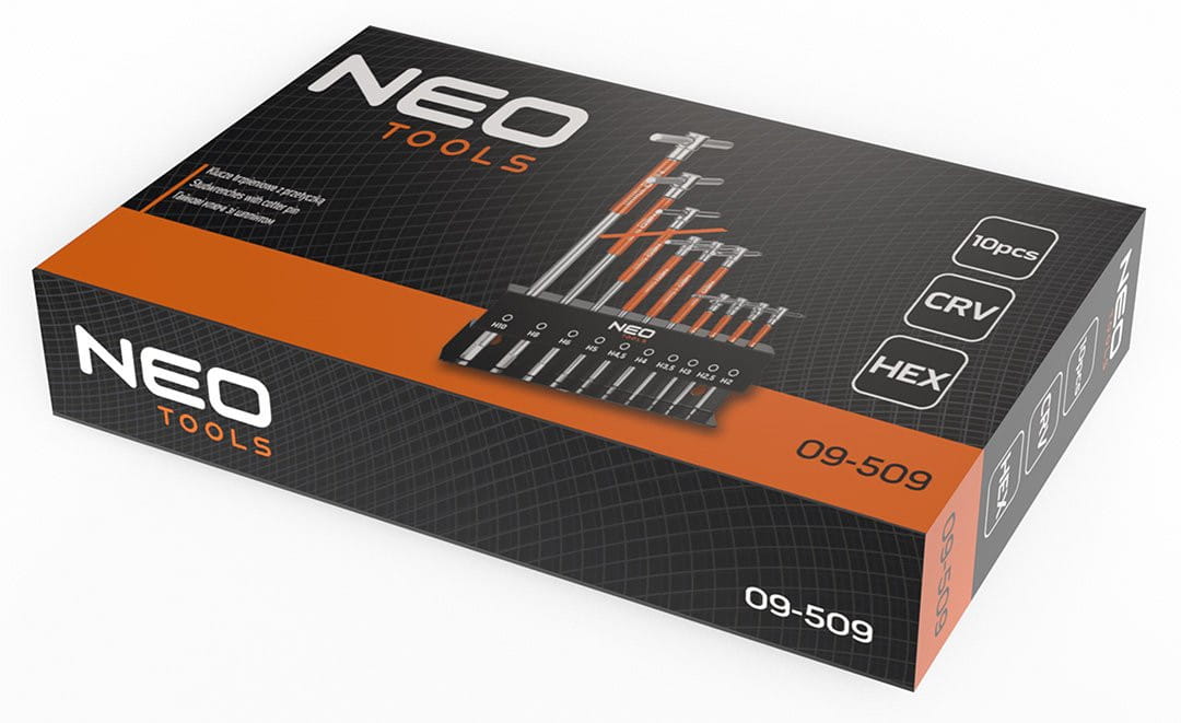 Klucze trzpieniowe z przetyczką. Zestaw 10 szt. w stojaku 2 - 10 mm 09-509 marki NEO TOOLS to zestaw składający się z kluczy typu HEX (sześciokątnych) w 10 różnych rozmiarach oraz praktycznego stojaka z możliwością powieszenia o wymiarach 220 x 40 x 82 mm (rozstaw otworów do powieszenia – 175 mm). Klucze zostały wykonane z trwałego stopu metali CRV. Oferowane są w rozmiarach: H2 (125 x 65 mm), H2,5 (125 x 65 mm), H3 (125 x 65 mm), H3,5 (125 x 65 mm), H4 (177 x 90 mm), H4,5 (177 x 90 mm), H5 (181 x 89 mm), H6 (209 x 106 mm), H8,(250 x 122 mm), H10 (300 x 145 mm). Ze względu na swoją długość oraz różnorodność pozwalają na dostęp do głębiej położonych śrub. Zestaw marki NEO TOOLS oferuje również dwie opcje użycia: dłuższa część może pełnić funkcję pokrętła, natomiast przetyczka posiada końcówki typu HEX w wybranym rozmiarze. Klucze sprawdzą się wszędzie tam, gdzie wykorzystuje się klucze typu HEX (imbusowe), m.in. do odkręcania śrub, regulacji np. w serwisach rowerowych lub podczas prac montażowych. Za sprawą oferowanego w zestawie stojaka łatwo zachować porządek i mieć je na wyciągnięcie ręki.