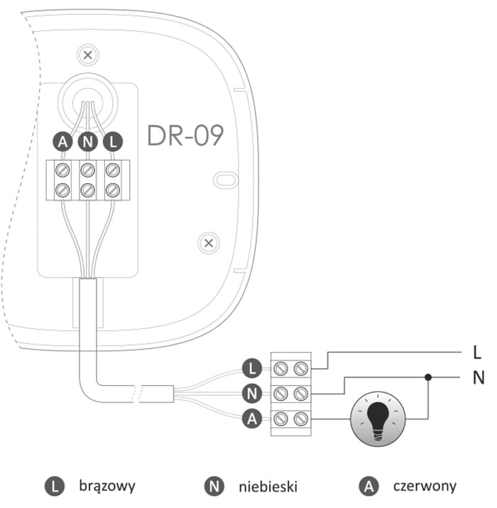Działanie czujnika ruchu: Czujnik wykrywa źródła promieniowania podczerwonego. Analizuje takie parametry, jak: wielkość obiektu, ilość emitowanego ciepła oraz szybkość przemieszczania się pomiędzy poszczególnymi sektorami detekcji. Czujnik wykrywa ruch w osi i promieniu własnym. Ruch w polu detekcji powoduje automatyczne załączenie oświetlenia. Od momentu załączenia ciągły ruch powoduje trwałe załączenie oświetlenia. Dopiero brak ruchu w polu detekcji wyzwala czas podtrzymania oświetlenia. Ponowny ruch w polu detekcji i jego zanik w trakcie odmierzania czasu, wyzwoli czas podtrzymania od początku.Charakter działania pozwala wykorzystać DR-09-IP65 jako czujnik obecności. Obszar pola detekcji wynosi: dla obecności do 6 m średnicy, a dla ruchu do 20 m średnicy. Czujnik ruchu wyposażony jest w automat zmierzchowy, uniemożliwiający załączenie sterowanego oświetlenia w ciągu dnia. Stan detekcji i gotowość do załączenia oświetlenia aktywowane są dopiero po zmierzchu. Moment aktywacji czujnika może być korygowany przez użytkownika potencjometrem. Dodatkowo istnieje możliwość regulacji czasu załączenia odbiornika w zakresie 10 s÷30 min.