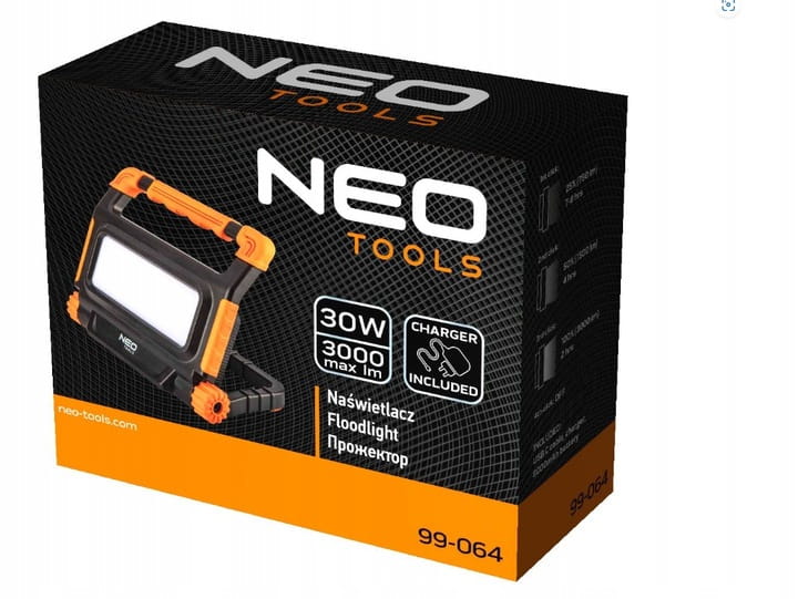 Naświetlacz akumulatorowy wyposażony jest w wysokiej klasy diodę SMD LED o strumieniu świetlnym 3000 lumenów oraz mocy 30 W. Produkt posiada 3 tryby świecenia: 3000/1500/750 lm. Naświetlacz można ustawiać pod różnymi kątami nachylenia i łatwo przenosić dzięki uchwytowi. Ładowanie za pomocą dołączanej ładowarki i dodatkowa funkcja gniazda usb, power bank. Zgodność z europejskimi standardami bezpieczeństwa potwierdza certyfikat CE