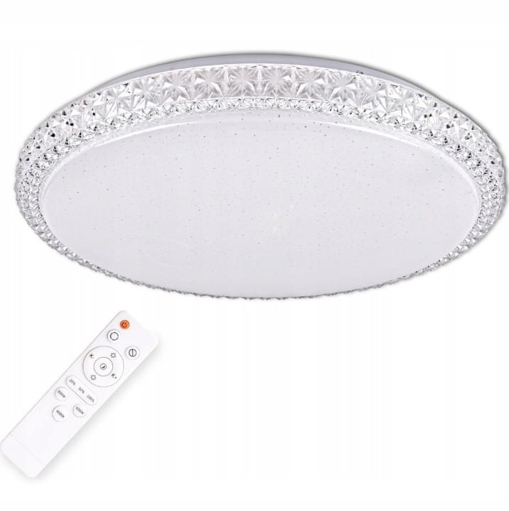 Plafon z pilotem za pomocą którego można płynnie zmienić barwę świecenia od ciepłej białej po zimno białą (2700K-6500K) oraz wybrać ilość światła, plafon z możliwością ściemniania.