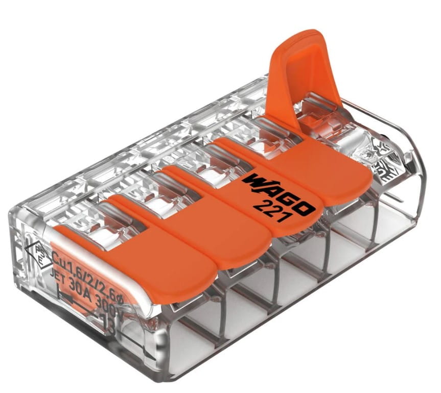 Złączka instalacyjna z dźwignią do wszystkich rodzajów przewodów, maks. 6 mm², 5-przew., kolor obudowy przezroczysty, temperatura otoczenia maksymalnie 85°C, (T85), 6,00 mm², transparentny.